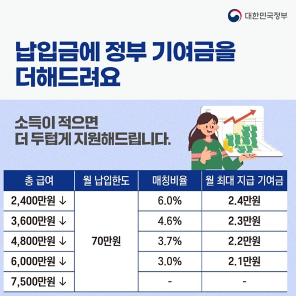 차상위계층, 기초생활수급자, 한부모가정 등은 더 많은 정부 기여금을 받을 수 있습니다.