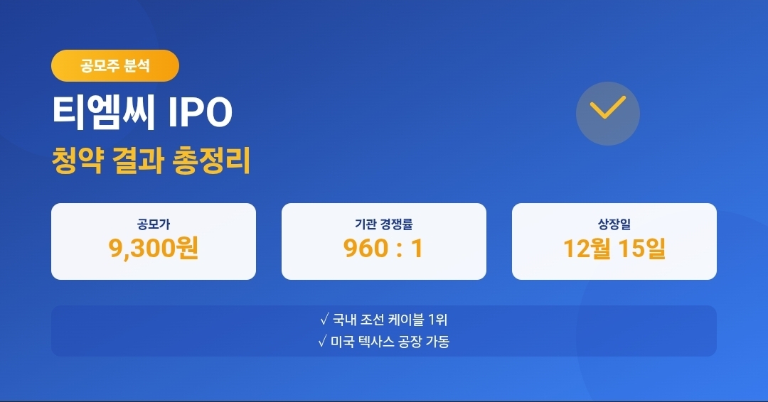 산업용 특수케이블 전문기업 티엠씨의 일반 청약이 12월 3일부터 4일까지 진행되었습니다. 이번 공모주 청약은 투자자들의 뜨거운 관심 속에 성황리에 마감되었습니다.