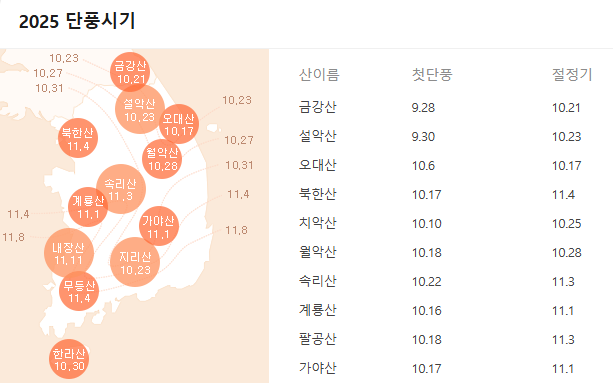 Tip. 설악산(10월 상·중순) → 오대산/내장산(10월 중·하순) → 지리산/팔공산(10월 하순~11월 초) 순으로 단풍이 남하하는 편이에요. 주말은 혼잡하니 평일 오전 방문을 추천!